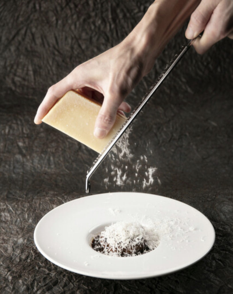 名物の和牛ハンバーグをトリュフ香る生卵に絡めていただきます。焼き加減はお好みで。