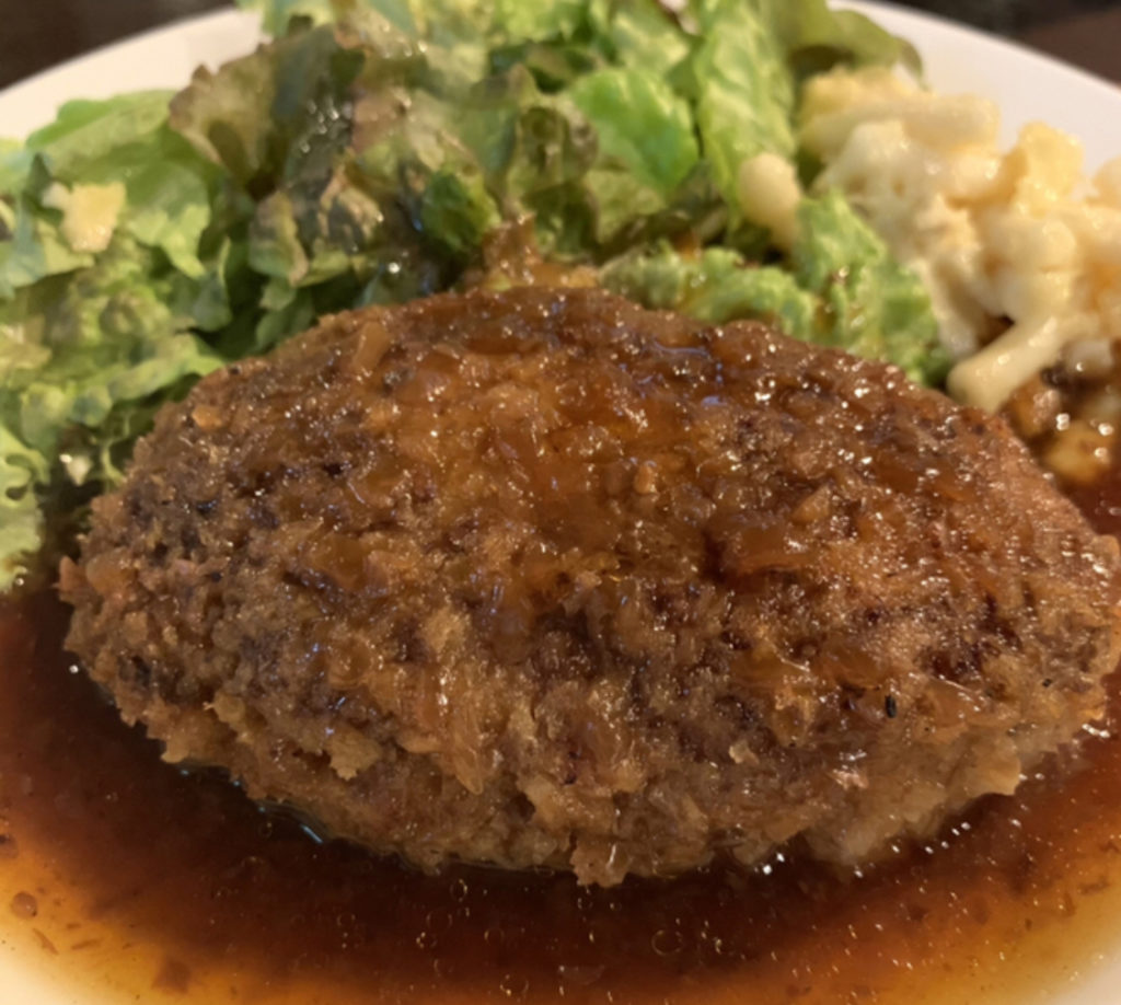 一度食べたら忘れられない名物ハンバーグ!大きめに切られた玉ねぎの食感が良いアクセントになっています。