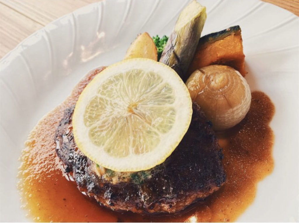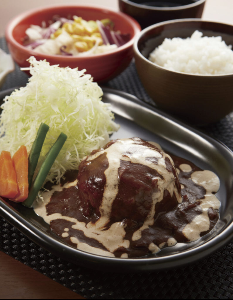 60年以上続く精肉店が営むステーキハウス。お箸ですっと切れる柔らかいハンバーグに濃厚なデミグラスソースが絡みつきます。